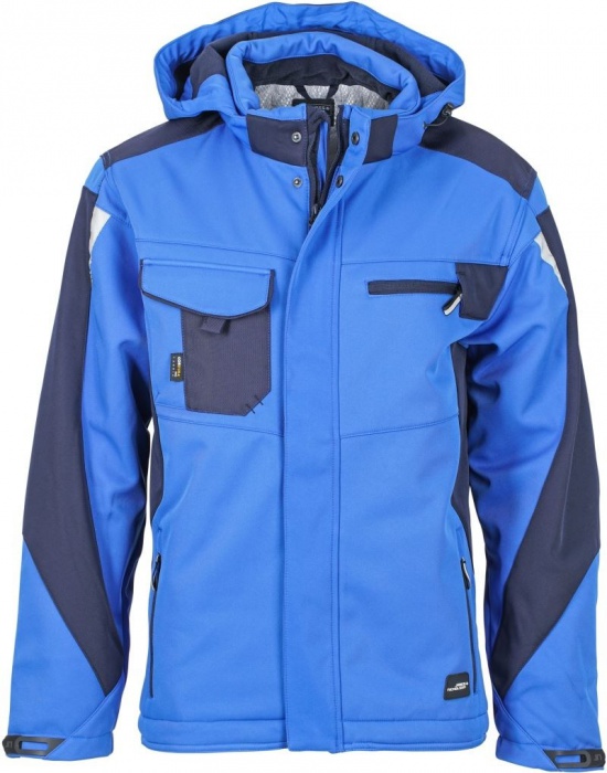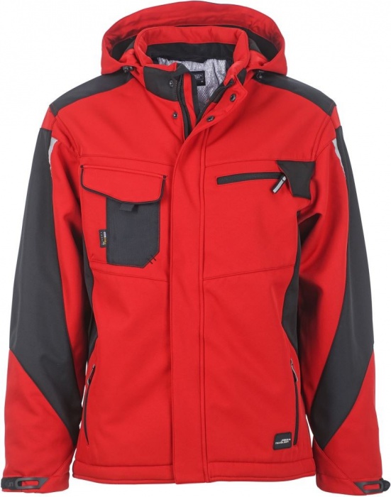 Pánská softshellová bunda s odnímatelnou kapucí. Límec s měkkým fleecem. Ochranná klopa na zip, teplé vnitřní manžety u rukávů. Boční kapsy na zip, náprsní kapsa a vnitřní kapsa. Reflexní prvky na rukávech a na zádech. Vodě a větru odolná (2.000 mm vodní sloupec), prodyšná a paropropustná tkanina (2.000 g/m2/24h). Ramenní část vyztužená materiálem CORDURA.
